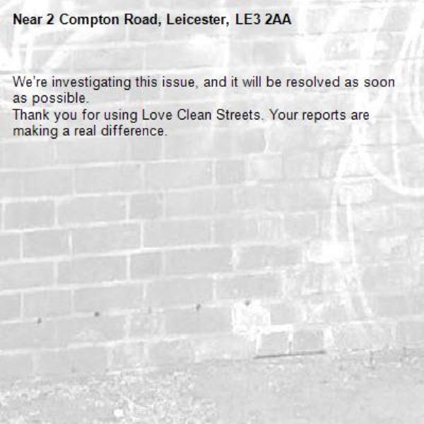 -2 Compton Road, Leicester, LE3 2AA 03/04/2026 10:45 We’re investigating this issue, and it will be resolved as soon as possible. Thank you for using Love Clean Streets. Your reports are making a real difference.