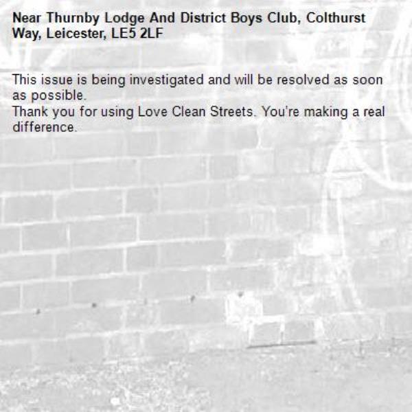 -Thurnby Lodge And District Boys Club, Colthurst Way, Leicester, LE5 2LF 30/01/2026 10:59 This issue is being investigated and will be resolved as soon as possible. Thank you for using Love Clean Streets. You’re making a real difference.