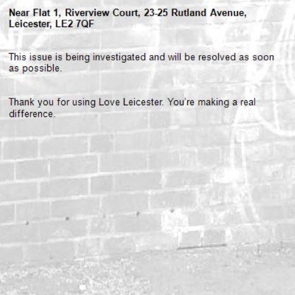 -Flat 1, Riverview Court, 23-25 Rutland Avenue, Leicester, LE2 7QF 25/03/2026 11:24 This issue is being investigated and will be resolved as soon as possible. Thank you for using Love Leicester. You’re making a real difference.