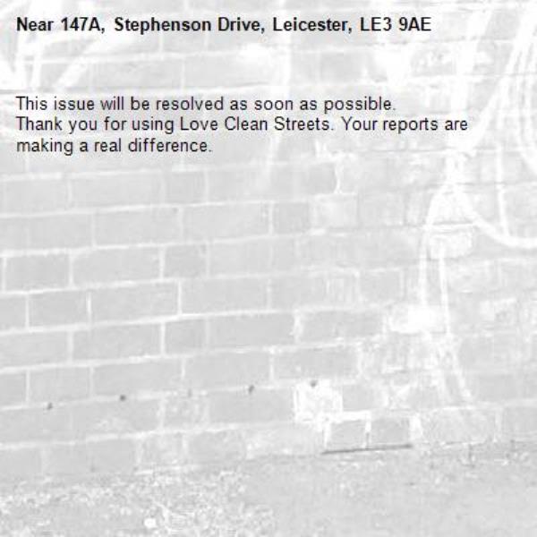 -147A, Stephenson Drive, Leicester, LE3 9AE 03/04/2026 10:07 This issue will be resolved as soon as possible. Thank you for using Love Clean Streets. Your reports are making a real difference.