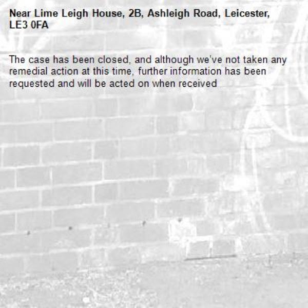 The case has been closed, and although we’ve not taken any remedial action at this time, further information has been requested and will be acted on when received-Lime Leigh House, 2B, Ashleigh Road, Leicester, LE3 0FA 16/01/2026 12:30 The case has been closed, and although we’ve not taken any remedial action at this time, further information has been requested and will be acted on when received