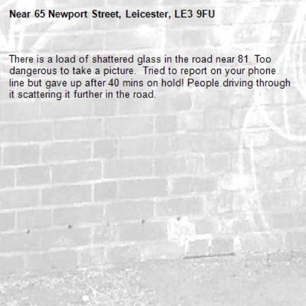 There is a load of shattered glass in the road near 81. Too dangerous to take a picture. Tried to report on your phone line but gave up after 40 mins on hold! People driving through it scattering it further in the road.