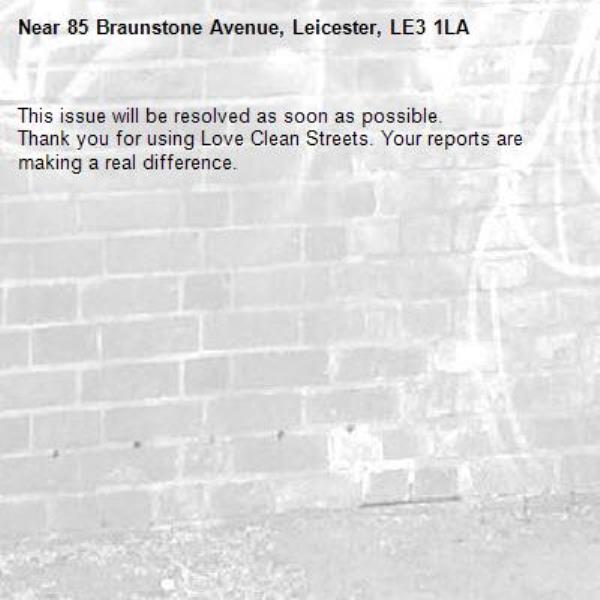 -85 Braunstone Avenue, Leicester, LE3 1LA 19/02/2026 07:20 This issue will be resolved as soon as possible. Thank you for using Love Clean Streets. Your reports are making a real difference.