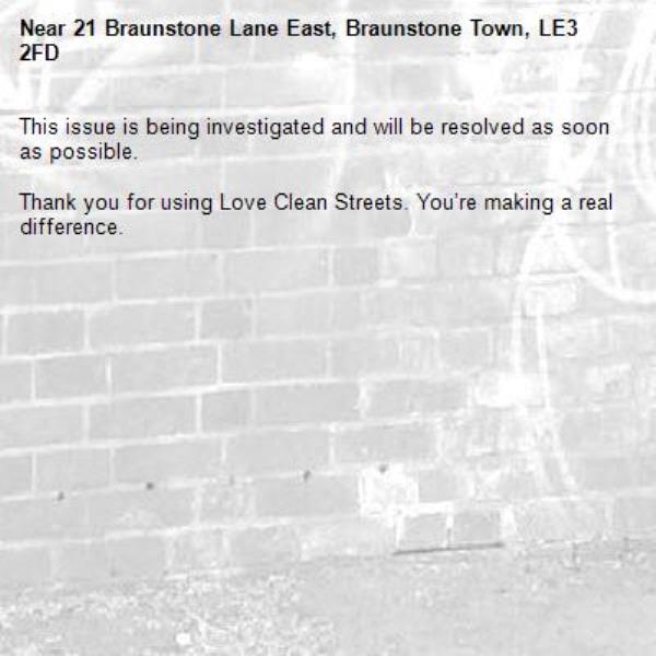 -21 Braunstone Lane East, Braunstone Town, LE3 2FD 21/01/2026 10:52 This issue is being investigated and will be resolved as soon as possible. Thank you for using Love Clean Streets. You’re making a real difference.