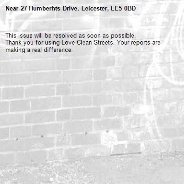 -27 Humberhts Drive, Leicester, LE5 0BD 16/04/2026 11:59 This issue will be resolved as soon as possible. Thank you for using Love Clean Streets. Your reports are making a real difference.