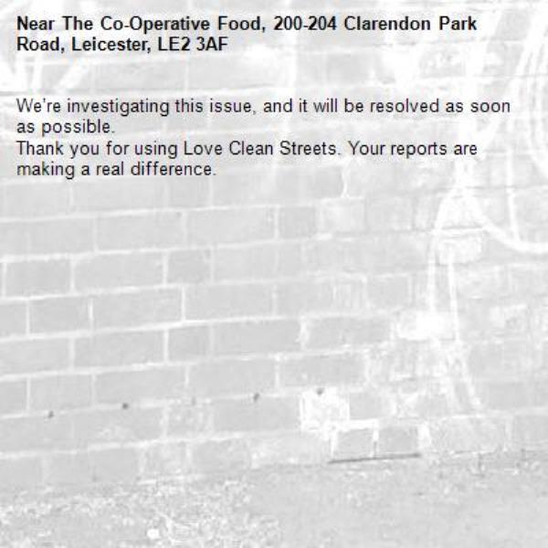 -The Co-Operative Food, 200-204 Clarendon Park Road, Leicester, LE2 3AF 25/03/2026 09:09 We’re investigating this issue, and it will be resolved as soon as possible. Thank you for using Love Clean Streets. Your reports are making a real difference.