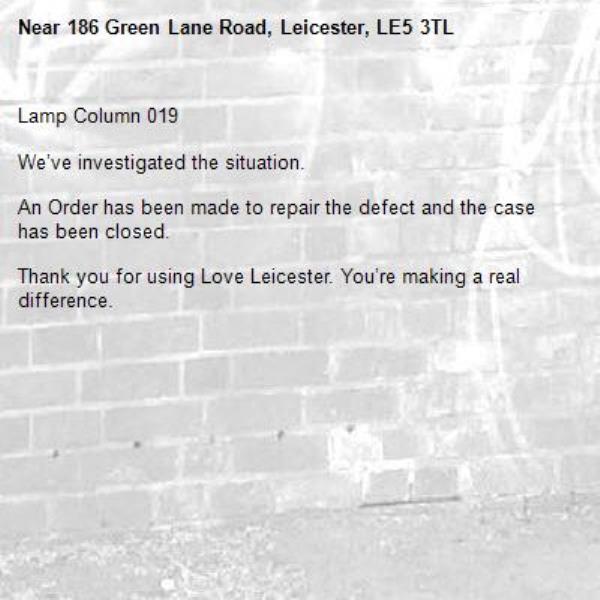 -186 Green Lane Road, Leicester, LE5 3TL 05/01/2026 14:49 Lamp Column 019 We’ve investigated the situation. An Order has been made to repair the defect and the case has been closed. Thank you for using Love Leicester. You’re making a real difference.