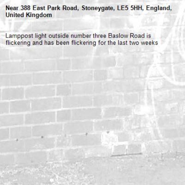 Lamppost light outside number three Baslow Road is flickering and has been flickering for the last two weeks