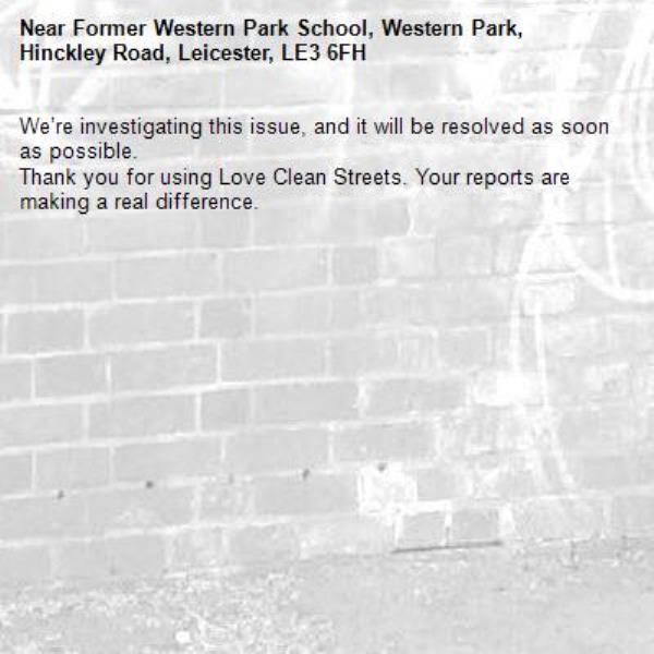 -Former Western Park School, Western Park, Hinckley Road, Leicester, LE3 6FH 14/01/2026 15:27 We’re investigating this issue, and it will be resolved as soon as possible. Thank you for using Love Clean Streets. Your reports are making a real difference.