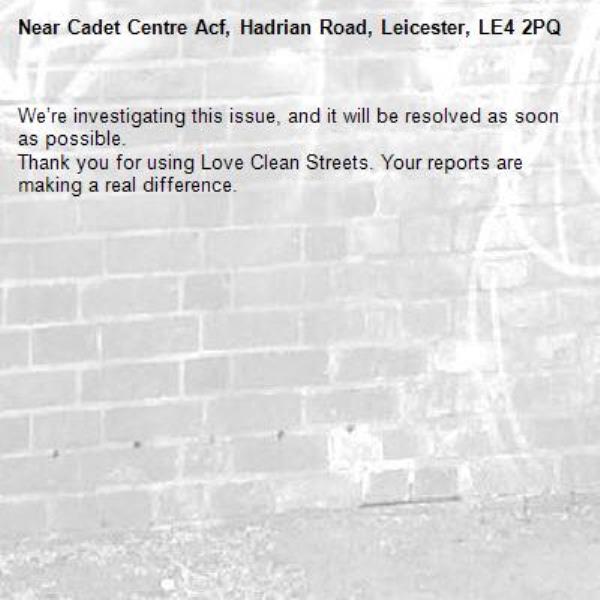 -Cadet Centre Acf, Hadrian Road, Leicester, LE4 2PQ 09/03/2026 13:12 We’re investigating this issue, and it will be resolved as soon as possible. Thank you for using Love Clean Streets. Your reports are making a real difference.