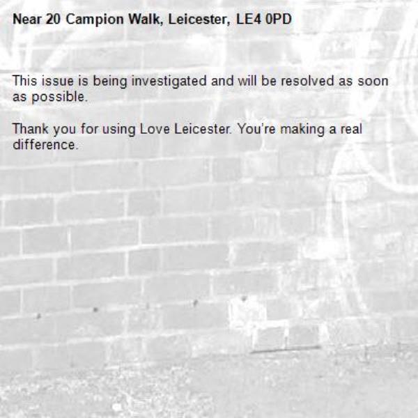 -20 Campion Walk, Leicester, LE4 0PD 06/11/2025 16:01 This issue is being investigated and will be resolved as soon as possible. Thank you for using Love Leicester. You’re making a real difference.