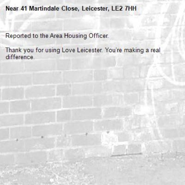 Thank you for using Love Leicester. You’re making a real difference.-41 Martindale Close, Leicester, LE2 7HH 17/05/2023 15:30 Reported to the Area Housing Officer.