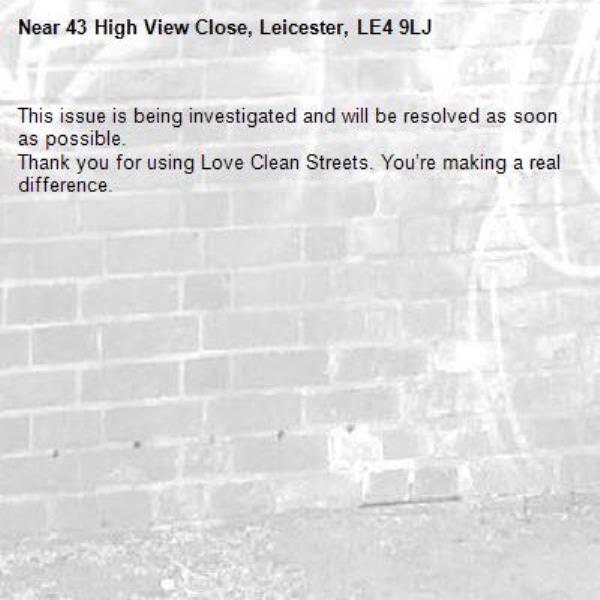 -43 High View Close, Leicester, LE4 9LJ 18/03/2026 12:59 This issue is being investigated and will be resolved as soon as possible. Thank you for using Love Clean Streets. You’re making a real difference.