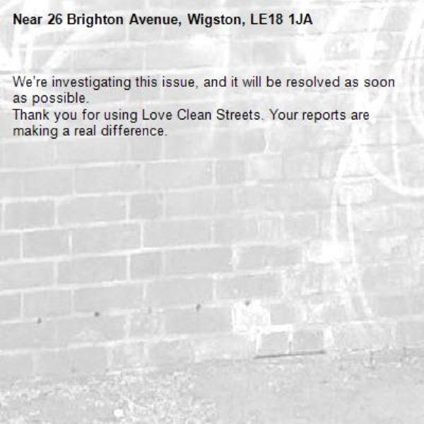 -26 Brighton Avenue, Wigston, LE18 1JA 15/01/2026 15:19 We’re investigating this issue, and it will be resolved as soon as possible. Thank you for using Love Clean Streets. Your reports are making a real difference.