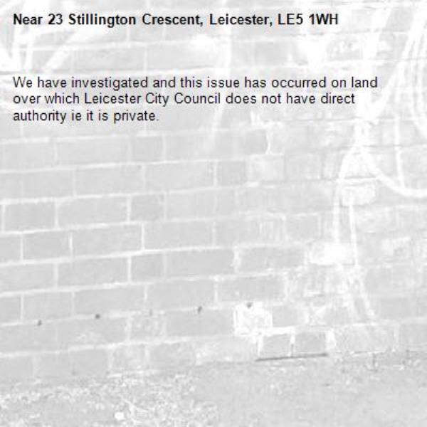We have investigated and this issue has occurred on land over which Leicester City Council does not have direct authority ie it is private. -23 Stillington Crescent, Leicester, LE5 1WH 30/10/2025 14:26 We have investigated and this issue has occurred on land over which Leicester City Council does not have direct authority ie it is private.