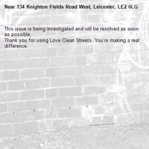 -134 Knighton Fields Road West, Leicester, LE2 6LG 27/04/2026 08:48 This issue is being investigated and will be resolved as soon as possible. Thank you for using Love Clean Streets. You’re making a real difference.