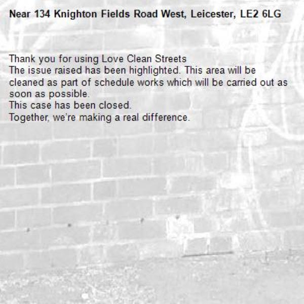 -134 Knighton Fields Road West, Leicester, LE2 6LG 27/04/2026 08:48 Thank you for using Love Clean Streets