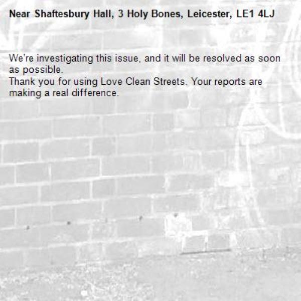 -Shaftesbury Hall, 3 Holy Bones, Leicester, LE1 4LJ 16/10/2025 10:27 We’re investigating this issue, and it will be resolved as soon as possible. Thank you for using Love Clean Streets. Your reports are making a real difference.