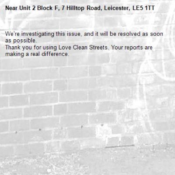 -Unit 2 Block F, 7 Hilltop Road, Leicester, LE5 1TT 16/03/2026 11:10 We’re investigating this issue, and it will be resolved as soon as possible. Thank you for using Love Clean Streets. Your reports are making a real difference.