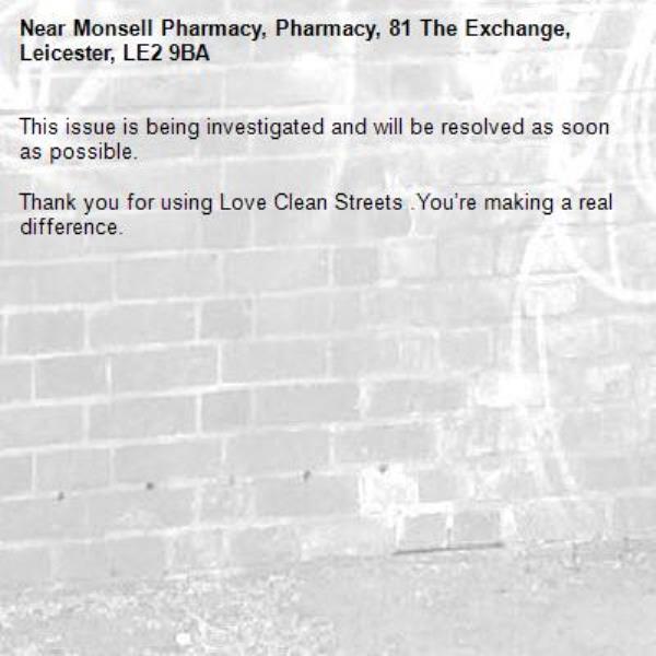 -Monsell Pharmacy, Pharmacy, 81 The Exchange, Leicester, LE2 9BA 31/10/2025 14:47 This issue is being investigated and will be resolved as soon as possible. Thank you for using Love Clean Streets .You’re making a real difference.