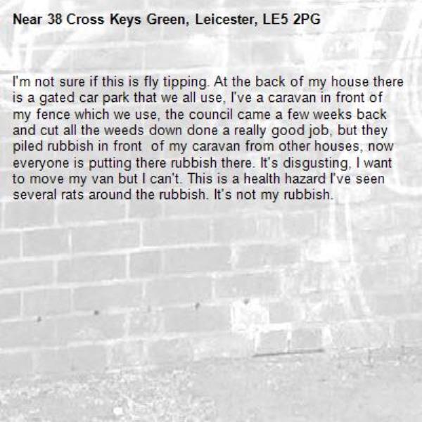 I'm not sure if this is fly tipping. At the back of my house there is a gated car park that we all use, I've a caravan in front of my fence which we use, the council came a few weeks back and cut all the weeds down done a really good job, but they piled rubbish in front of my caravan from other houses, now everyone is putting there rubbish there. It's disgusting, I want to move my van but I can't. This is a health hazard I've seen several rats around the rubbish. It's not my rubbish.