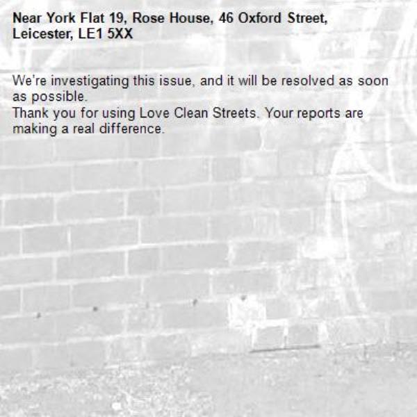 -York Flat 19, Rose House, 46 Oxford Street, Leicester, LE1 5XX 18/03/2026 13:06 We’re investigating this issue, and it will be resolved as soon as possible. Thank you for using Love Clean Streets. Your reports are making a real difference.