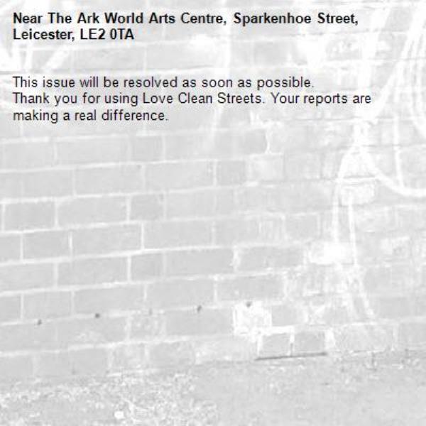 -The Ark World Arts Centre, Sparkenhoe Street, Leicester, LE2 0TA 21/11/2025 08:33 This issue will be resolved as soon as possible. Thank you for using Love Clean Streets. Your reports are making a real difference.
