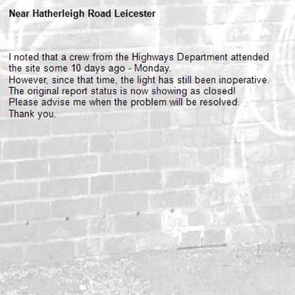 I noted that a crew from the Highways Department attended the site some 10 days ago - Monday.<br/>However, since that time, the light has still been inoperative.<br/>The original report status is now showing as closed!<br/>Please advise me when the problem will be resolved.<br/>Thank you.