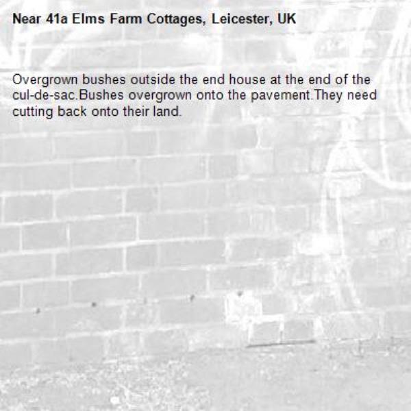 Overgrown bushes outside the end house at the end of the cul-de-sac.Bushes overgrown onto the pavement.They need cutting back onto their land.