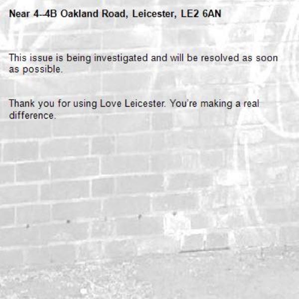 -4--4B Oakland Road, Leicester, LE2 6AN 21/04/2026 14:38 This issue is being investigated and will be resolved as soon as possible. Thank you for using Love Leicester. You’re making a real difference.