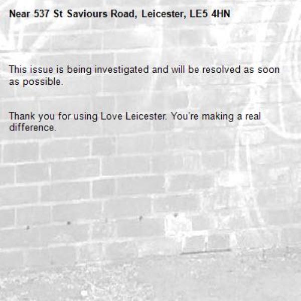 -537 St Saviours Road, Leicester, LE5 4HN 14/02/2026 10:47 This issue is being investigated and will be resolved as soon as possible. Thank you for using Love Leicester. You’re making a real difference.