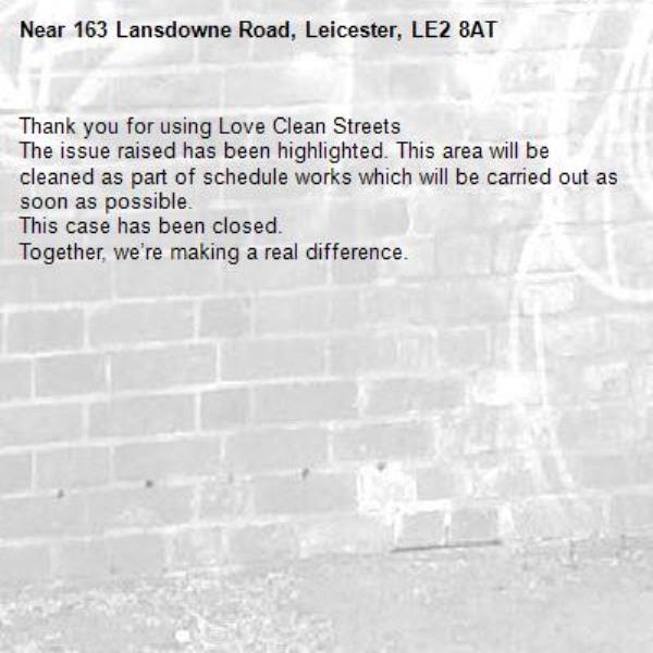 -163 Lansdowne Road, Leicester, LE2 8AT 23/03/2026 08:35 Thank you for using Love Clean Streets