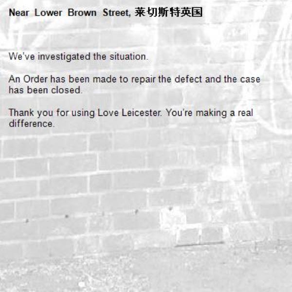 -Lower Brown Street, 莱切斯特英国 14/11/2025 09:33 We’ve investigated the situation. An Order has been made to repair the defect and the case has been closed. Thank you for using Love Leicester. You’re making a real difference.