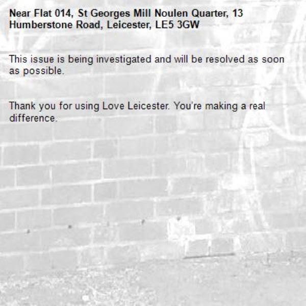 -Flat 014, St Georges Mill Noulen Quarter, 13 Humberstone Road, Leicester, LE5 3GW 03/12/2025 08:05 This issue is being investigated and will be resolved as soon as possible.