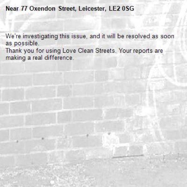 -77 Oxendon Street, Leicester, LE2 0SG 30/03/2026 13:45 We’re investigating this issue, and it will be resolved as soon as possible. Thank you for using Love Clean Streets. Your reports are making a real difference.