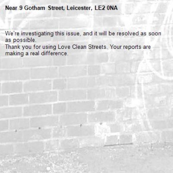 -9 Gotham Street, Leicester, LE2 0NA 16/03/2026 08:33 We’re investigating this issue, and it will be resolved as soon as possible. Thank you for using Love Clean Streets. Your reports are making a real difference.