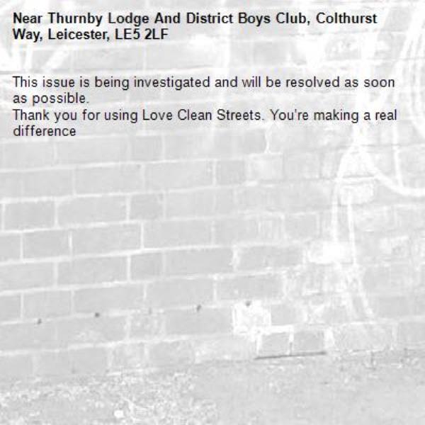 -Thurnby Lodge And District Boys Club, Colthurst Way, Leicester, LE5 2LF 02/12/2025 12:38 This issue is being investigated and will be resolved as soon as possible. Thank you for using Love Clean Streets. You’re making a real difference