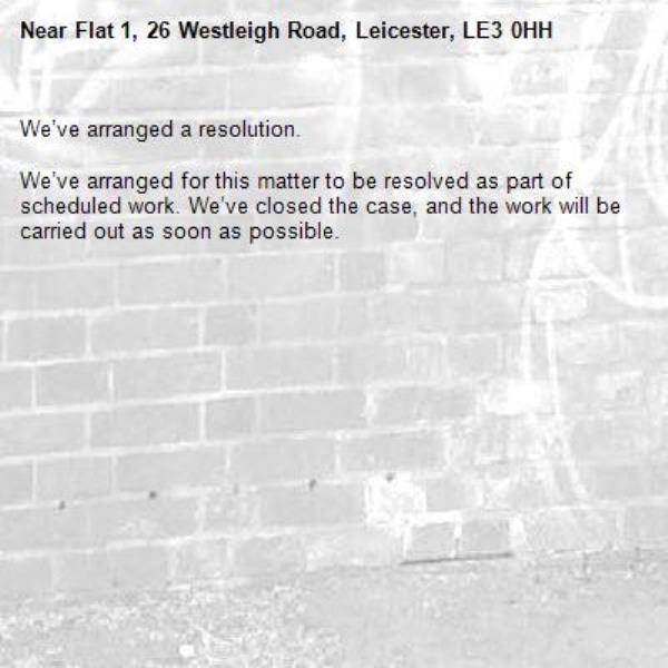 -Flat 1, 26 Westleigh Road, Leicester, LE3 0HH 12/02/2026 15:53 We’ve arranged a resolution. We’ve arranged for this matter to be resolved as part of scheduled work. We’ve closed the case, and the work will be carried out as soon as possible.