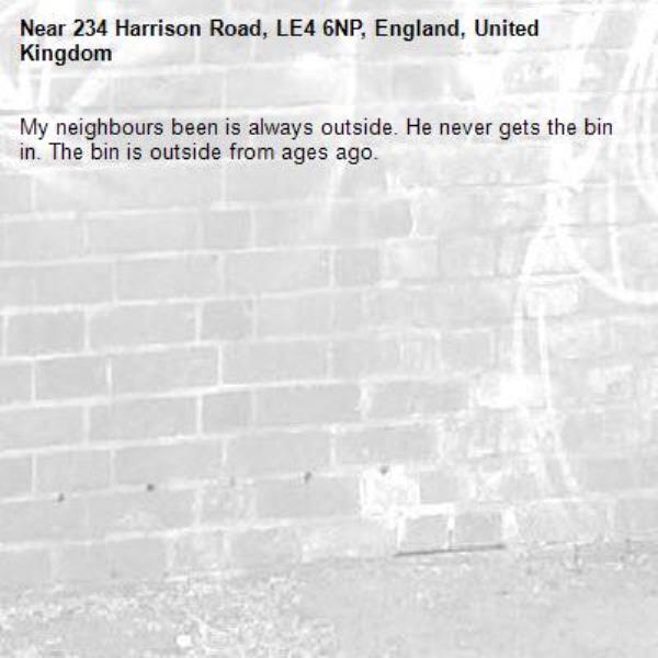 My neighbours been is always outside. He never gets the bin in. The bin is outside from ages ago.