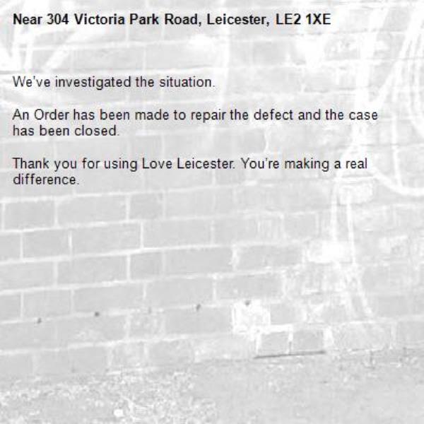 -304 Victoria Park Road, Leicester, LE2 1XE 14/11/2025 09:52 We’ve investigated the situation. An Order has been made to repair the defect and the case has been closed. Thank you for using Love Leicester. You’re making a real difference.