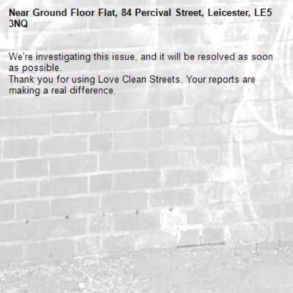 -Ground Floor Flat, 84 Percival Street, Leicester, LE5 3NQ 09/01/2026 10:58 We’re investigating this issue, and it will be resolved as soon as possible. Thank you for using Love Clean Streets. Your reports are making a real difference.