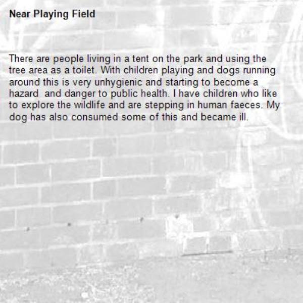 There are people living in a tent on the park and using the tree area as a toilet. With children playing and dogs running around this is very unhygienic and starting to become a hazard and danger to public health. I have children who like to explore the wildlife and are stepping in human faeces. My dog has also consumed some of this and became ill.