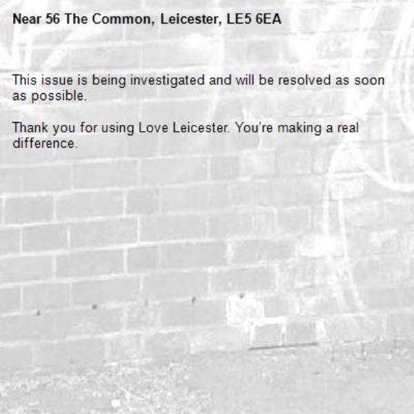 -56 The Common, Leicester, LE5 6EA 19/03/2026 15:57 This issue is being investigated and will be resolved as soon as possible. Thank you for using Love Leicester. You’re making a real difference.