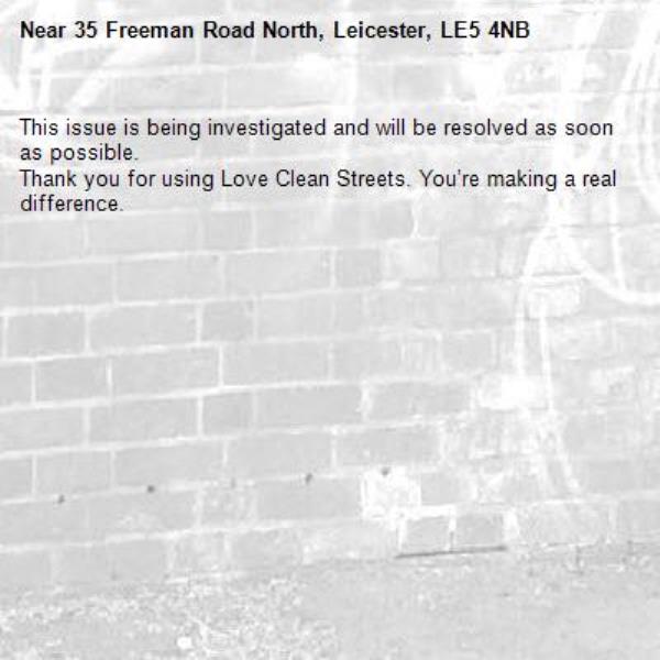 -35 Freeman Road North, Leicester, LE5 4NB 31/03/2026 14:38 This issue is being investigated and will be resolved as soon as possible. Thank you for using Love Clean Streets. You’re making a real difference.