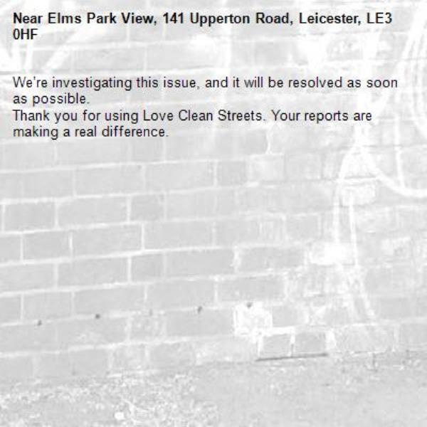 -Elms Park View, 141 Upperton Road, Leicester, LE3 0HF 01/04/2026 09:20 We’re investigating this issue, and it will be resolved as soon as possible. Thank you for using Love Clean Streets. Your reports are making a real difference.