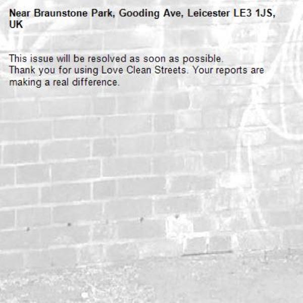 -139 Cort Crescent, Leicester, LE3 1QL 11/03/2026 08:52 This issue will be resolved as soon as possible. Thank you for using Love Clean Streets. Your reports are making a real difference.