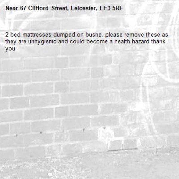 2 bed mattresses dumped on bushe. please remove these as they are unhygienic and could become a health hazard thank you