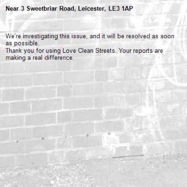 -3 Sweetbriar Road, Leicester, LE3 1AP 23/02/2026 09:16 We’re investigating this issue, and it will be resolved as soon as possible. Thank you for using Love Clean Streets. Your reports are making a real difference.