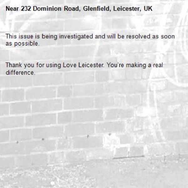 -232 Dominion Road, Glenfield, Leicester, UK 02/02/2026 13:42 This issue is being investigated and will be resolved as soon as possible. Thank you for using Love Leicester. You’re making a real difference.