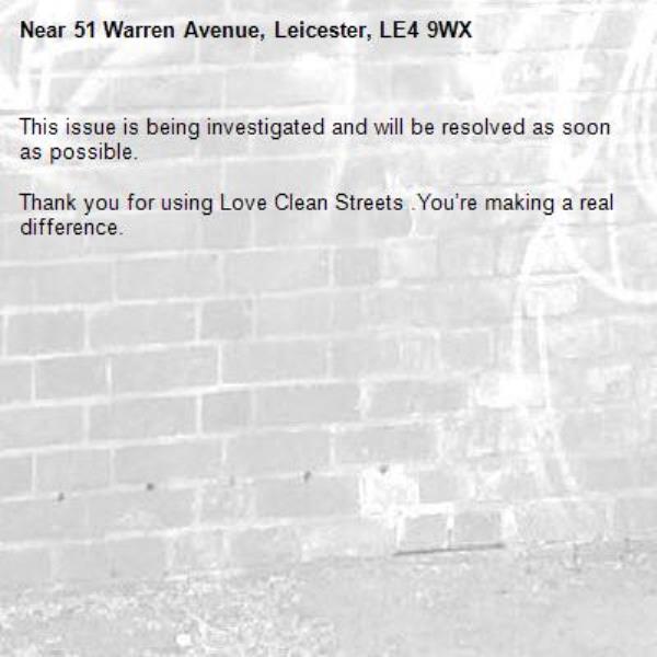 -51 Warren Avenue, Leicester, LE4 9WX 15/01/2026 14:15 This issue is being investigated and will be resolved as soon as possible. Thank you for using Love Clean Streets .You’re making a real difference.